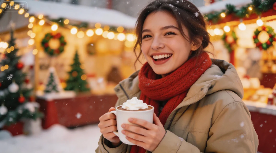 比如,Prompt:A low-resolution digital picture focuses on a woman in a thick winter coat holding a mug of hot cocoa, laughing. Festive lights and blurred market stalls with holiday decorations fill the background under a light snowfall.