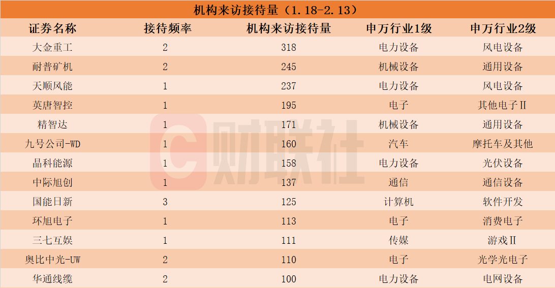 数据显示,近一个月(1.18-2.13)包括大金重工、耐普矿机、天顺风能、英唐智控、精智达、九号公司-WD、晶科能源、中际旭创、国能日新、环旭电子、三七互娱、奥比中光-UW、华通线缆在内的13家上市公司机构来访接待量超100家(含100家),具体情况见下图: