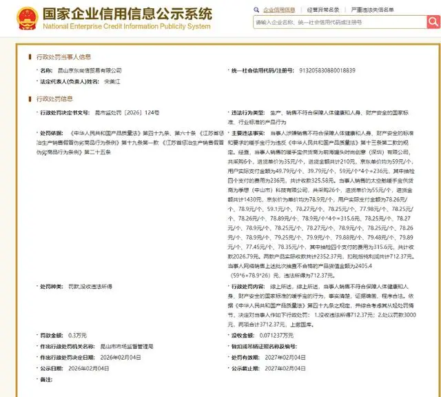 随着产业规模扩大,品控也成为不得不重视的问题。近日,据国家企业信用信息公示系统,京东集团全资子公司昆山京东尚信贸易有限公司,因销售不符合保障人体健康和人身、财产安全国家标准、行业标准的暖手宝,被昆山市市场监督管理局依法处以没收违法所得712.37元,处以罚款3000元,两项合计3712.37元的行政处罚。