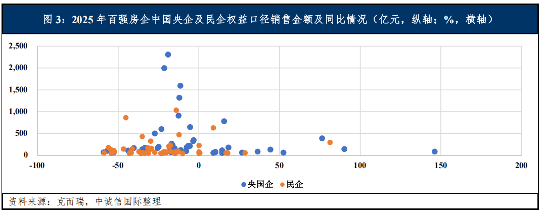 从权益销售金额维度看,自2024年“9.26政治局会议”以来的政策定调,及后续一系列“促需求、稳预期”政策的密集出台与落地,2025年,尽管行业销售规模整体仍在下降,但降幅已有所收窄,当前房地产行业处于明确的“止跌回稳”关键周期。具体来看,仅2家房企实现销售额正增长,较上年数量进一步减少;绝大部分央国企的销售降幅能够控制在20%以内;销售降幅在20%~40%及40%以上的区间,则主要由民营企业和部分混合所有制企业占据。考虑到居民收入预期依然偏弱,短期销售规模仍面临压力,预计2026年房地产销售规模仍将处于调整与筑底阶段,但销售规模的下降幅度有望进一步缩窄。