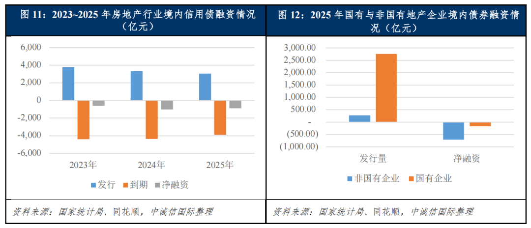 中诚信国际认为,2025年房地产行业融资规模维持收缩,政策端的支持方向也从短期的救急纾困,逐步过渡至长效发展机制的系统性构建,其中房企融资“白名单”进入常态化实施阶段,“金融16条”政策接续发力,叠加专项借款与纾困基金的持续加码,为防范化解系统性风险筑牢了坚实屏障;预计2026年房地产行业金融政策重心仍将着力于完善房地产融资的基础性制度,审慎对待短期刺激,资金链缓解仍需房企自身的造血功能得到改善,同时需持续关注部分非央国企控股房企面临的短期兑付压力以及已出险房企的信用修复情况,短期内国有参股房企的外部支持意愿或分化。