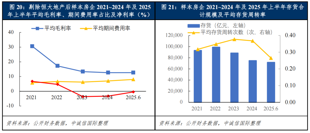 从毛利率维度看,随着前期高地价项目集中结转接近尾声,2024年样本房企营业毛利率下滑趋势普遍延续,至2025年上半年平均毛利率已初步企稳。预计随着前期低毛利项目结算完毕,且2023年以来房企在土地市场上更为理性和谨慎,这些新获取的、利润率空间相对合理的项目将于2026年及以后陆续进入结转周期,预计2026年行业毛利率有望在低位企稳,但受限于当前市场供需关系已发生根本变化,房价缺乏大幅上涨基础,毛利率显著反弹仍面临制约。