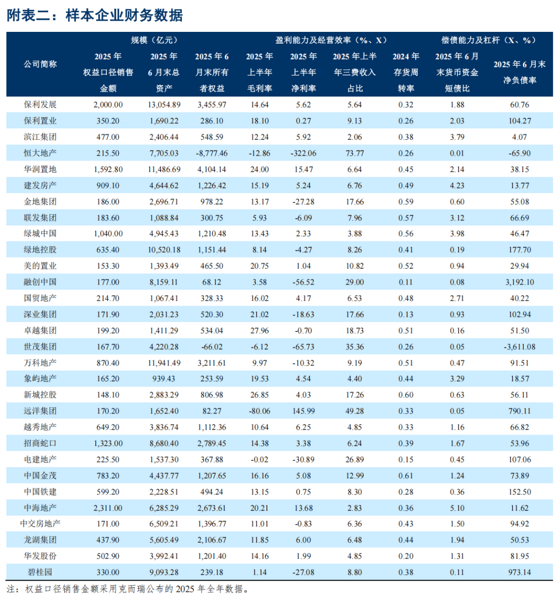 ● 2025年以来样本企业销售业绩降幅边际收窄,但受项目初始盈利空间压缩、减值损失增加等因素影响,行业亏损面进一步扩大,在审慎经营策略下,企业投资持续收缩,总资产及净资产规模同比下滑,财务杠杆水平持续攀升,偿债指标持续弱化。但样本企业毛利率呈现初步企稳态势,且部分高能级布局的房企展现出较强的盈利修复能力,行业整体已步入深度调整后的筑底与分化阶段。