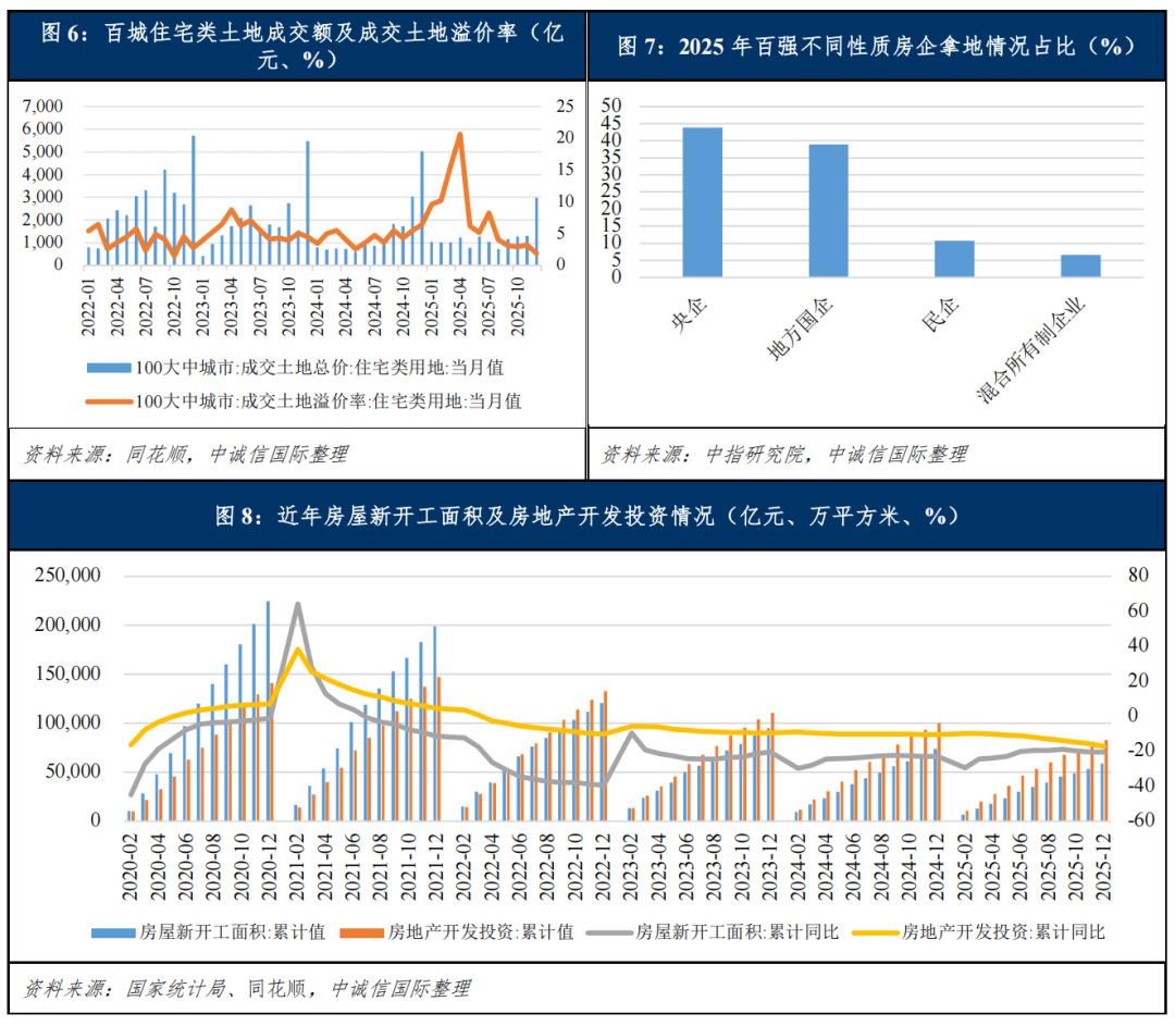 中诚信国际认为,2025年行业投资规模整体呈下行态势,但核心区域的土地拍卖仍显现出较高热度。预计2026年投资下行趋势或将持续,除部分核心城市的新房供应能保持一定体量外,大多数城市的新增楼盘供给有限,市场将以去化既有存量项目为主旋律,同时盘活存量用地及收购存量商品房的政策持续推进,供求平衡的修复进程仍面临挑战。