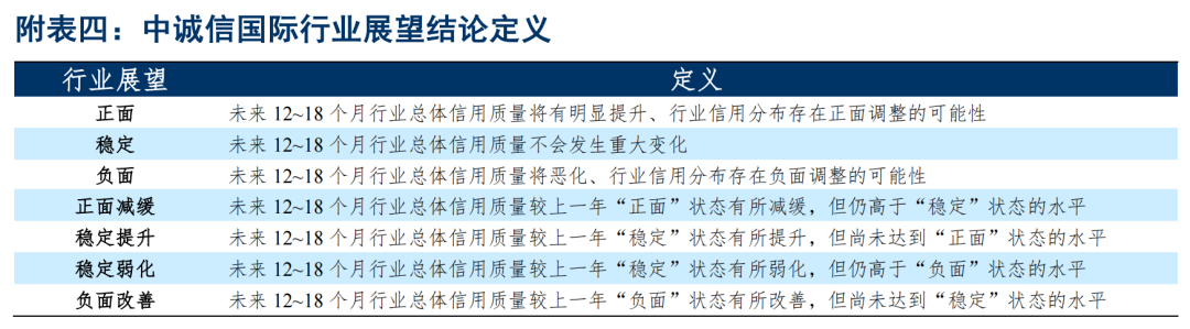 中诚信国际认为,未来12~18个月该行业总体信用质量较“负面”状态有所改善,但尚未达到“稳定”状态的水平。