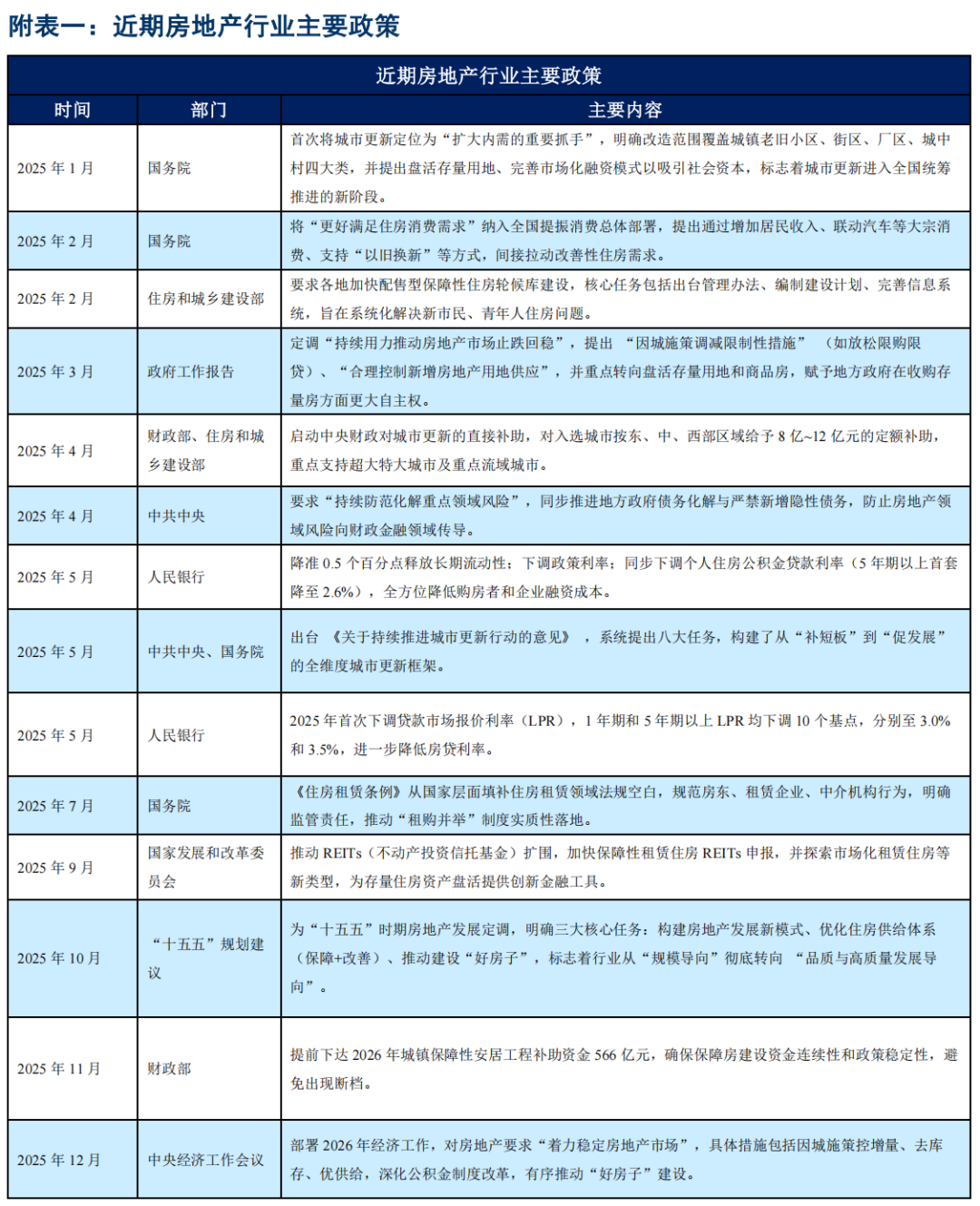 政策方面,2025年房地产行业政策围绕“稳市场、促转型、防风险、惠民生”系统推进,多维度构建发展新格局,其中短期刺激需求方面的政策力度较上年减弱。具体来看,城市更新成“扩大内需”核心抓手,1月国务院将城市更新定位为"扩大内需重要抓手",覆盖老旧小区等四类改造,创新市场化融资机制并获中央财政专项补助;刺激需求方面,2月住房消费纳入全国促消费部署,5月央行降准0.5个百分点、下调LPR及公积金贷款利率(首套5年期以上至2.6%);保障与租赁领域,2月住建部推进配售型保障房轮候库建设,7月《住房租赁条例》填补国家法规空白;风险防控上,4月中央要求防控重点领域风险,阻断地产风险向财政金融传导,9月推动REITs扩围,探索市场化租赁住房等新融资工具。2025年12月,中央经济工作会议部署2026年经济工作,对房地产要求“着力稳定房地产市场”,具体措施包括因城施策控增量、去库存、优供给,深化公积金制度改革,有序推动“好房子”建设等,稳定市场预期及增加优质供给仍较为迫切。预计2026年政策端仍以改善预期为主,逐步推进长效发展机制的系统性构建。