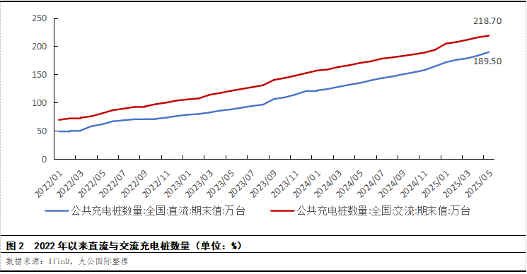 技术结构特征:交流充电为主,直流占比持续提升。公共充电桩作为城市充电网络的核心组成部分,其供给能力和技术构成直接影响着广大电动汽车用户的出行体验。在技术构成上,公共充电桩主要分为交流充电桩(慢充)和直流充电桩(快充)两大类。交流充电桩通过车载充电机为电池充电,功率较小,充电时间长,但成本低廉,适用于城市公共停车场、商场和居民小区等长时间停车的场景。直流充电桩则可以直接为汽车动力电池充电,功率大,充电时间短,但成本高昂,适用于运营车充电站、高速公路服务区等对充电效率要求高的场景。