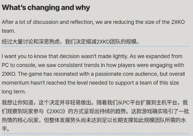随后不久,当地时间2月9日,拳头游戏宣布缩减格斗游戏《2XKO》开发团队的规模,这一变动距离该游戏在主机与PC平台的正式上线仅仅过去不到三周。拳头游戏在官方公告称:“这款游戏确实吸引了一批热情的核心玩家,但随着我们将市场从PC拓展至主机端,整体的发展势头尚未达到足以长期支撑如此规模团队所需的水平。”