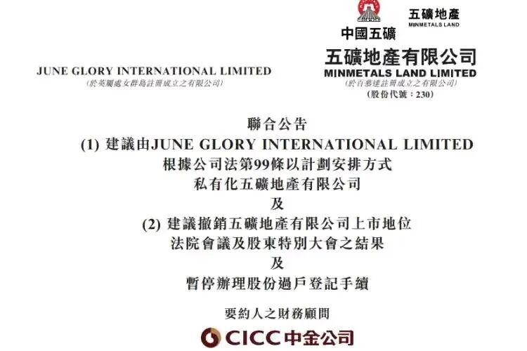 2月9日,五矿地产(00230.HK)发布公告:私有化计划获法院会议及股东特别大会高票通过,赞成票占比高达99.90%,反对票仅0.10%。