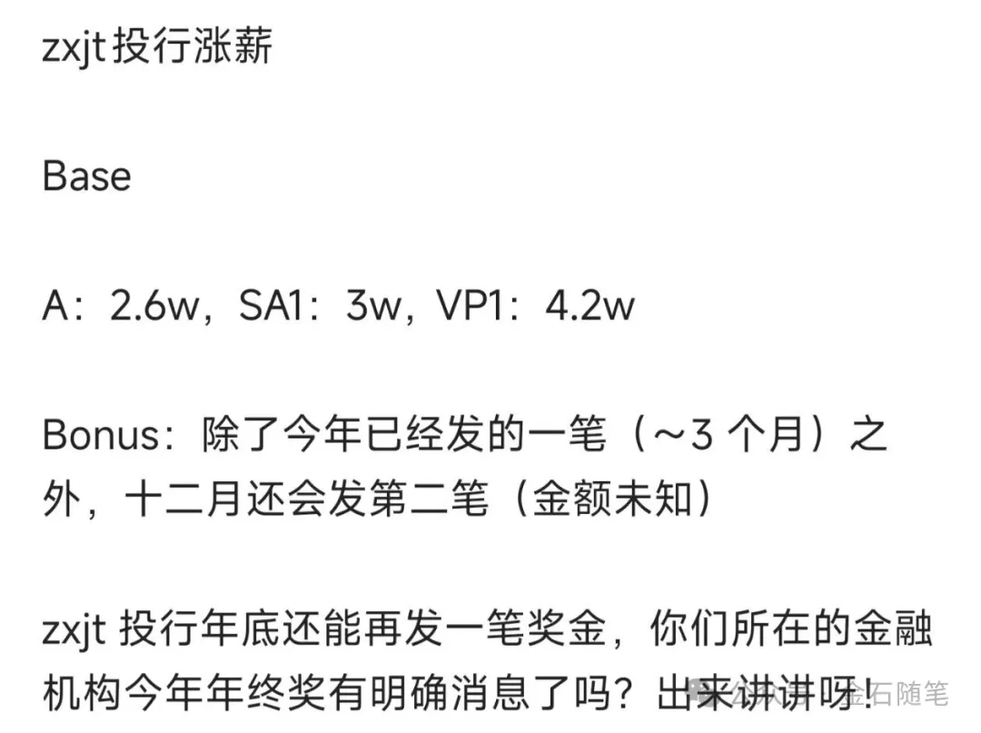 另据社区平台,25司不仅给各个职级涨了base,而且还要发两笔年终,传闻第一笔3个月,第二笔金额未知,这年终可胜过了中信、中金了。