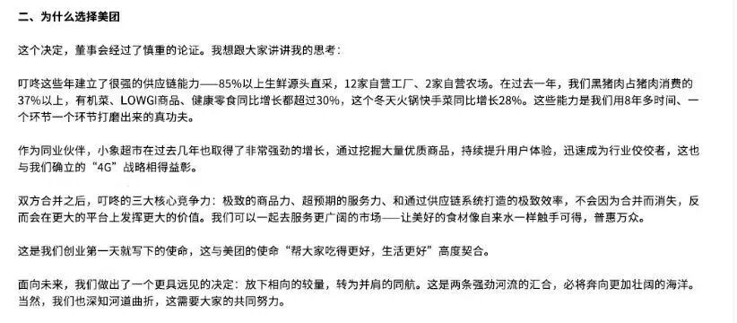而对于美团来说,此次收购绝非一时兴起,而是其巩固并扩大领先地位的又一关键落子。美团旗下的“小象超市”(前身为美团买菜),虽发展迅猛,但在商品力、生鲜供应链的深度和特色品类的开发上,与深耕多年的叮咚买菜相比仍有差距。