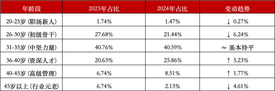 31-35岁年龄段是行业主力军,占比约40%。这个年龄段从业者通常拥有8-12年的经验,正处于体力和经验的巅峰。