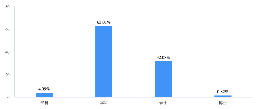 从调研数据看,地产从业者专科占比4.09%、本科占比63.01%、硕士占比32.08%、博士占比0.82%,其中硕士占比近年不断提升,已经达到1/3。