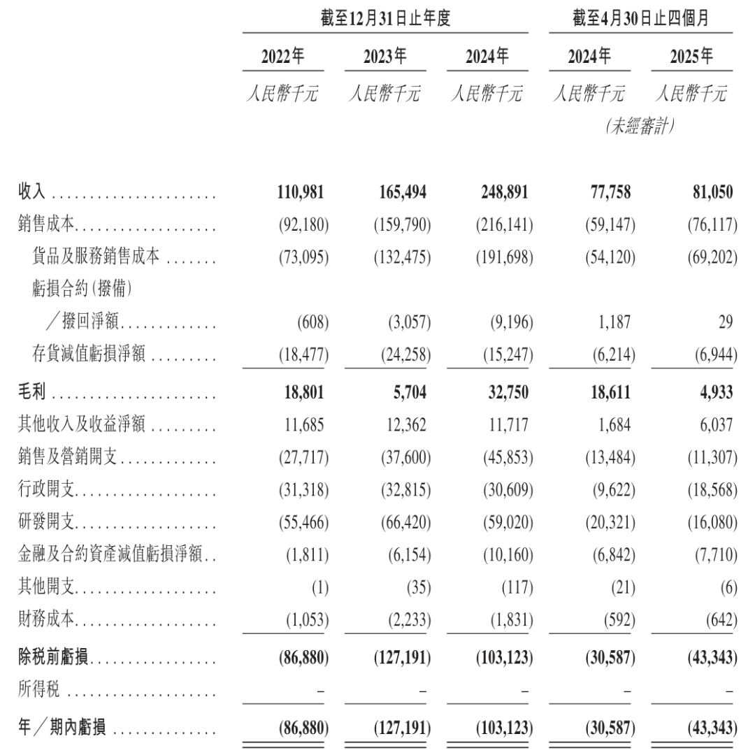 哥瑞利2025年前4个月营收8105万,毛利493万,期内亏损4334万元。