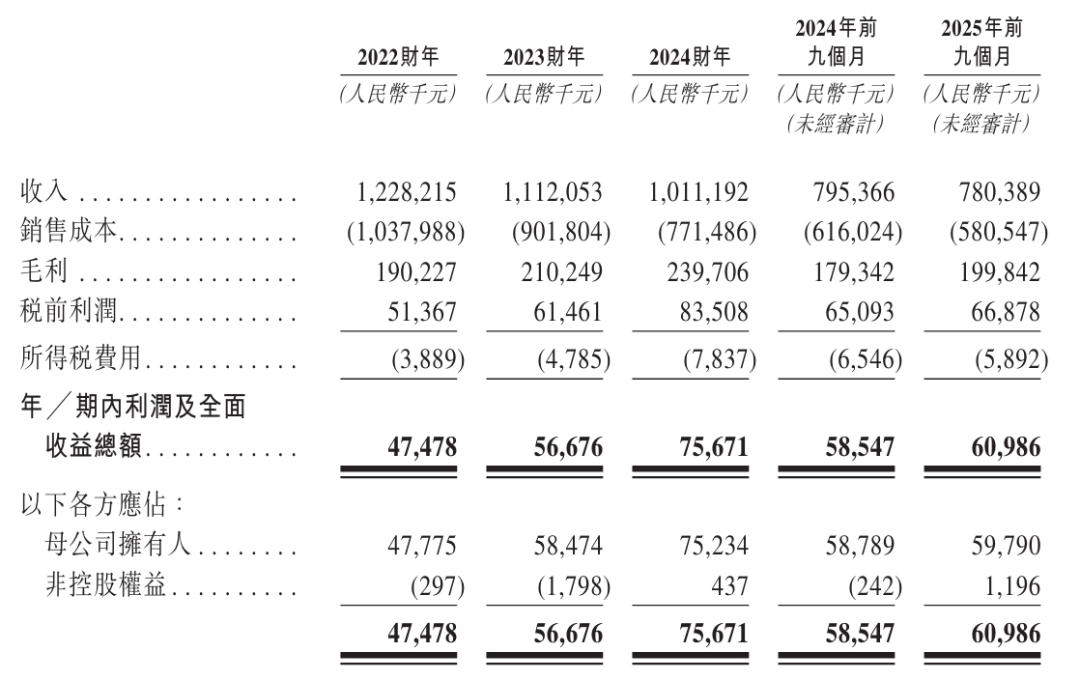招股书显示,宏业基2022年、2023年、2024年营收分别为12.28亿、11.12亿、10.11亿元;毛利分别为1.9亿、2.1亿、2.4亿元;期内利润分别为4748万、5668万、7567万元。
