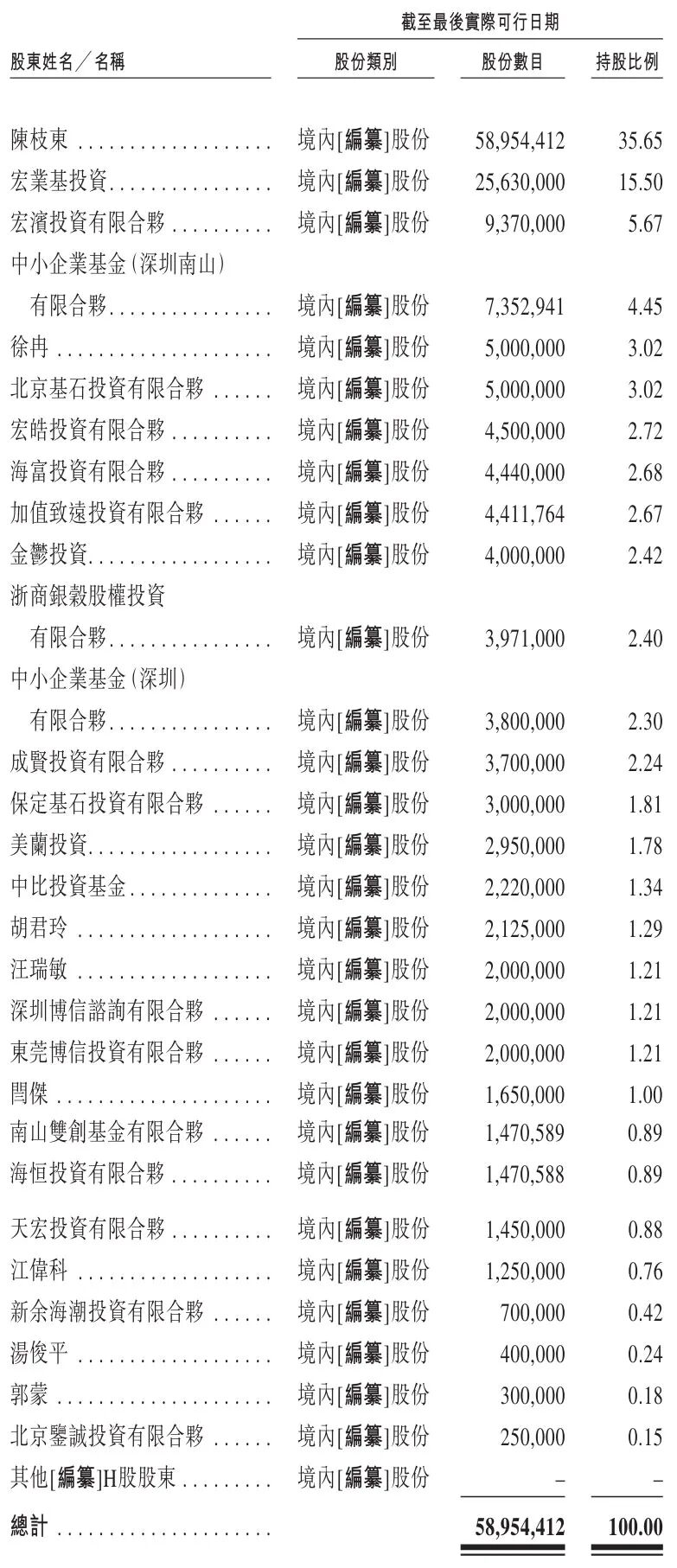 IPO前,陈枝东持股为35.65%,宏业基投资持股为15.5%,宏滨投资有限合伙持股为5.67%,中小企业基金(深圳南山)有限合伙持股为4.45%;