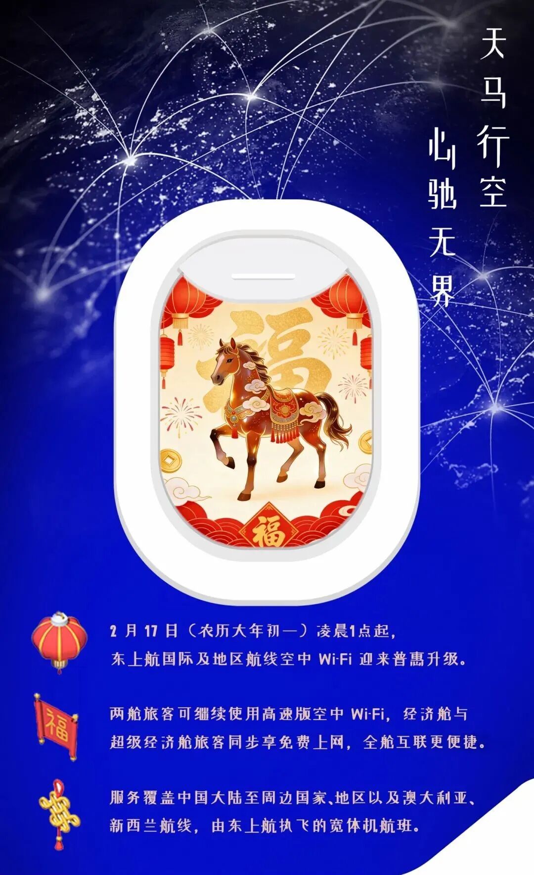 详见→除夕看春晚,年初一起所有舱位可享免费空中Wi-Fi!东航国际航线Wi-Fi服务升级