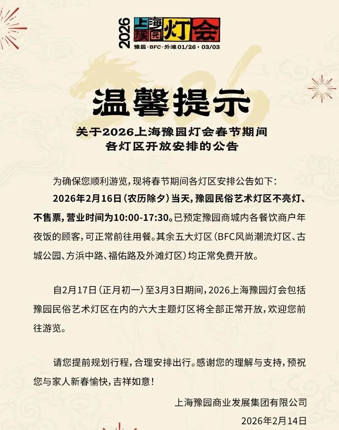 黄浦区新闻办介绍,2026年2月16日(农历除夕)当天,豫园民俗艺术灯区不亮灯、不售票,营业时间为10:00-17:30。已预定豫园商城内各餐饮商户年夜饭的顾客,可正常前往用餐。其余五大灯区(BFC风尚潮流灯区、古城公园、方浜中路、福佑路及外滩灯区)均正常免费开放。
