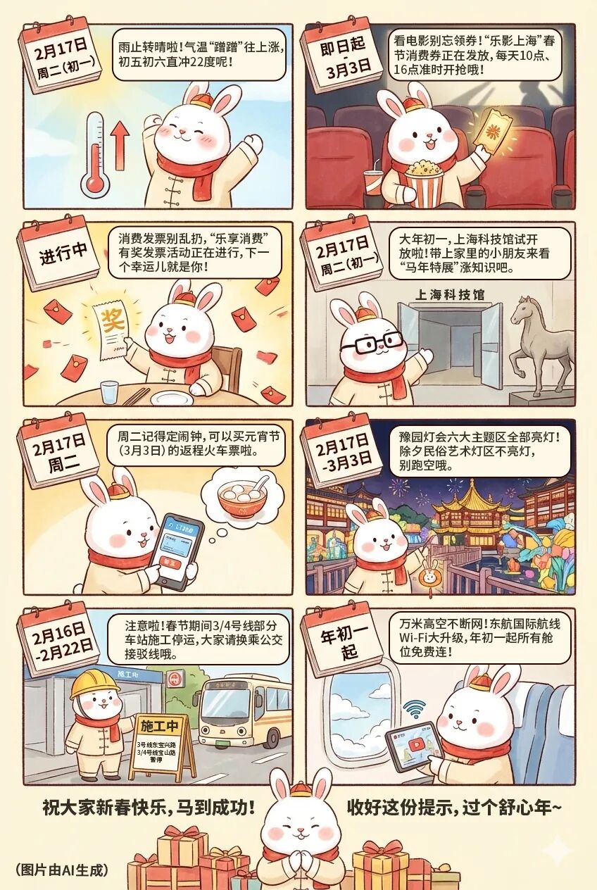 “乐影上海”春节消费券正在发放,有奖发票活动正在进行,上海科技馆大年初一(周二)试开放,周三雨水节气,周二可购买元宵节返程火车票,春运期间上海地铁延时运营,小客车免费通行共9天,米兰冬奥会正在进行中……本周还有哪些大事?速看本周提示↓