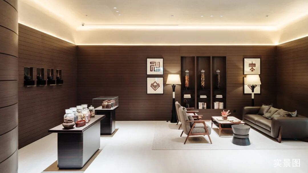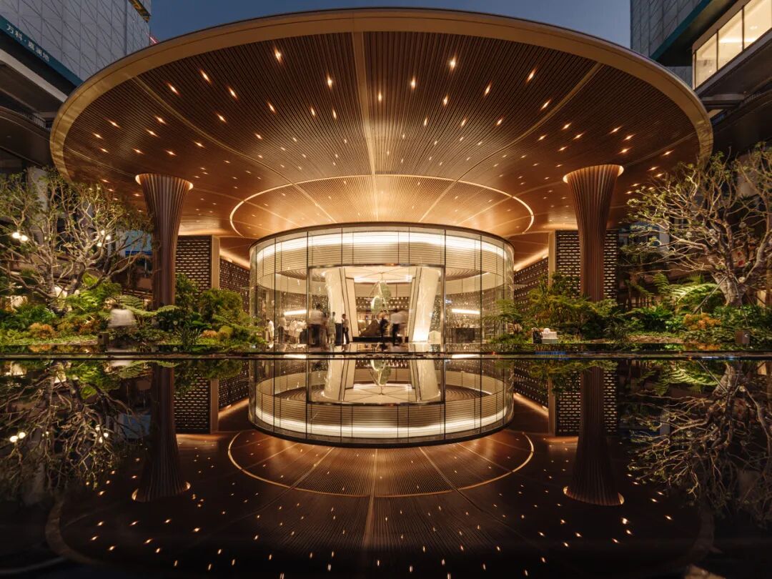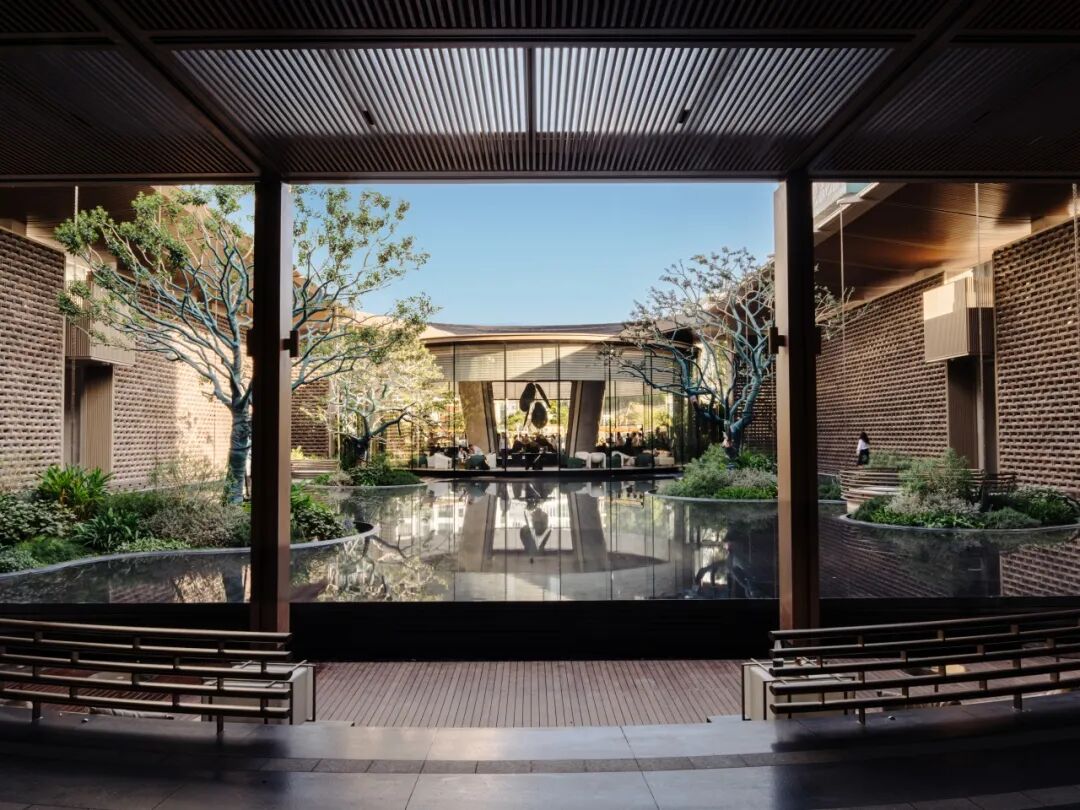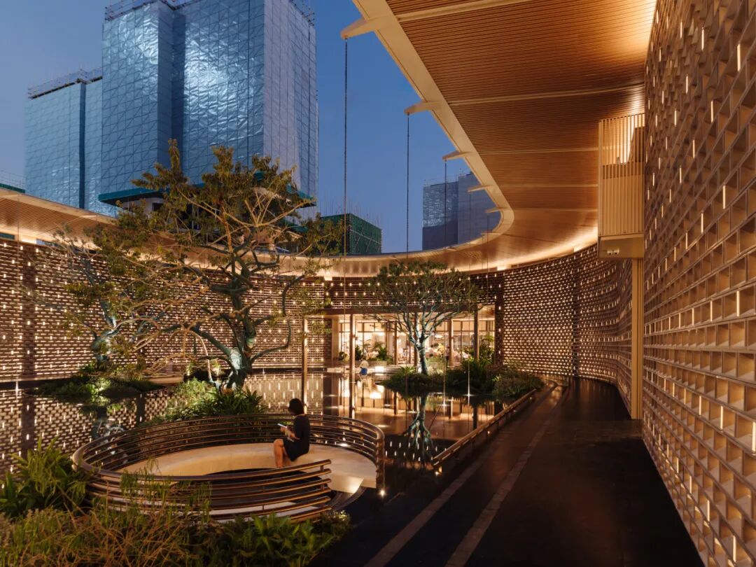 处于中央的“蔚澜之泉”,灵感源于三亚山谷中的潺潺溪流,巨构环形屋顶汲取客家围屋文化,围合超1200m2的神性水院。下方墙面由19800块定制艺术砖,构筑长达百米、高近10米的“艺术长卷”。当池中波光映射其上,脚步亦跟随粼粼光影而放缓。