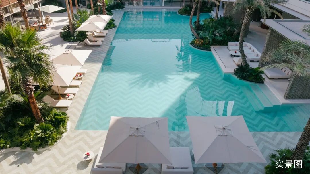 信步示范区内部,犹如徜徉一片三亚市心的静谧绿洲。来自曼谷的景观事务所TROP借鉴海内外高奢度假酒店形制,以“一心双庭”设计融合热带植被水景,带来丰富且宁静的度假氛围。
