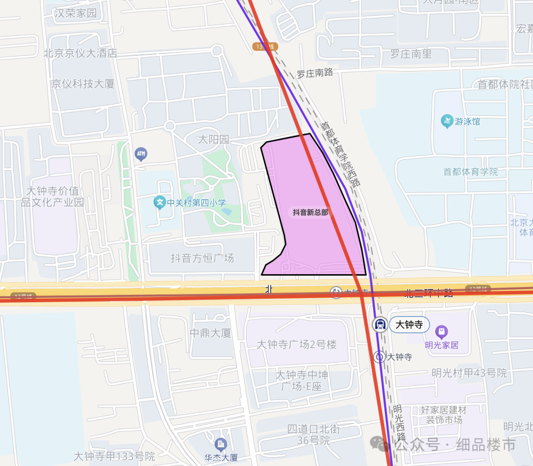 这宗地是实打实的“黄金宝地”:海淀北三环、中关村腹地,紧邻地铁12、13号线大钟寺站,与字节现有方恒广场办公区相邻,周边互联网人才、产业扎堆,先天优势拉满。
