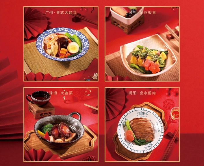 该套餐主打“匠心粤味”,主菜“金玉满堂鲍鱼红烧肉”以香糯的红烧肉搭配鲜嫩的鲍鱼,寓意吉祥美满,冷荤“瑞彩捞鸡”则取意“捞起捞起,风生水起”。同时,套餐还精选双福贺喜元宝红豆酥与紫薯山药糕两款粤式茶点,向旅客传递“新春好运连连”的祝愿。