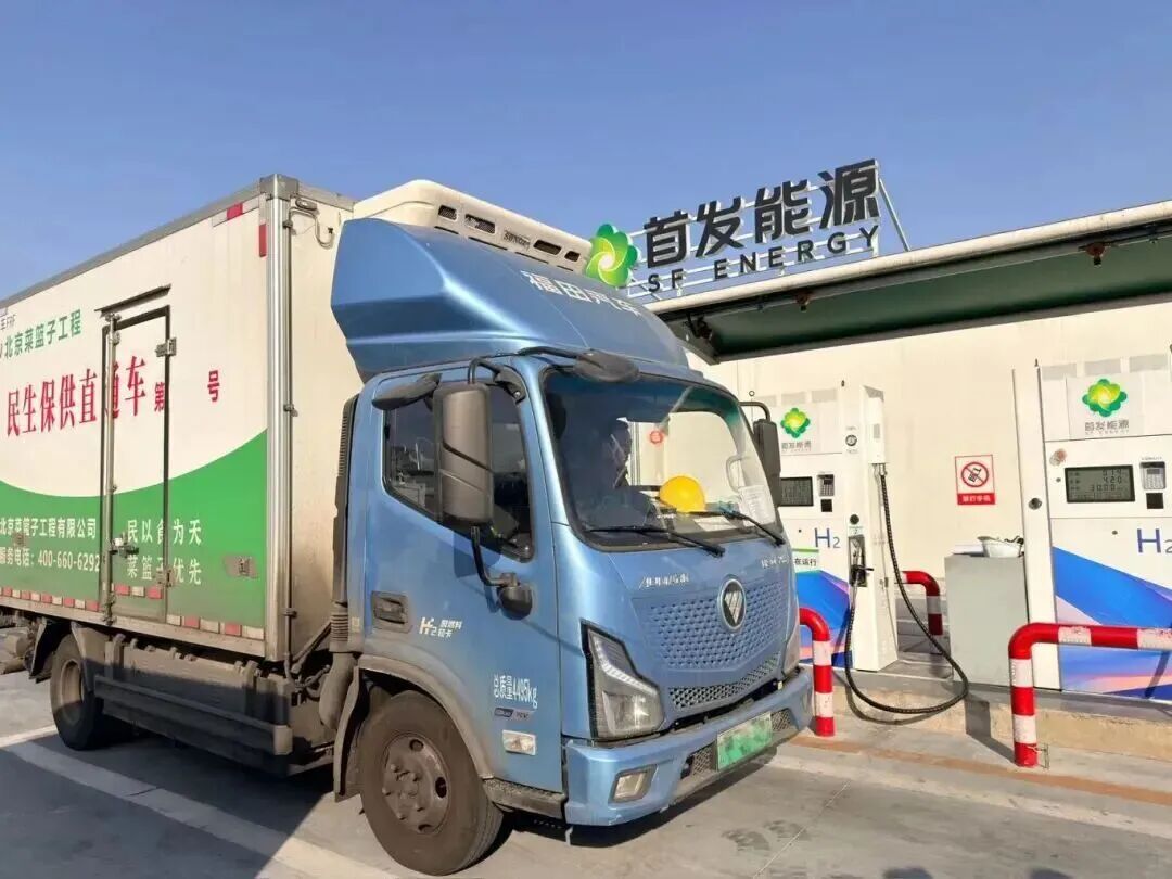 氢能源货车在马驹桥服务区内的加氢站补能。