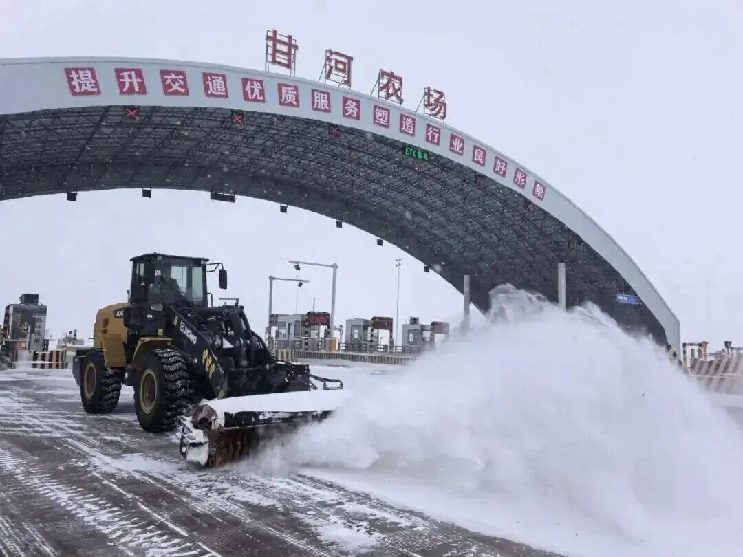 呼伦贝尔市公路通行费征收中心甘河农场收费站职工清理收费广场积雪,保障群众平安出行。