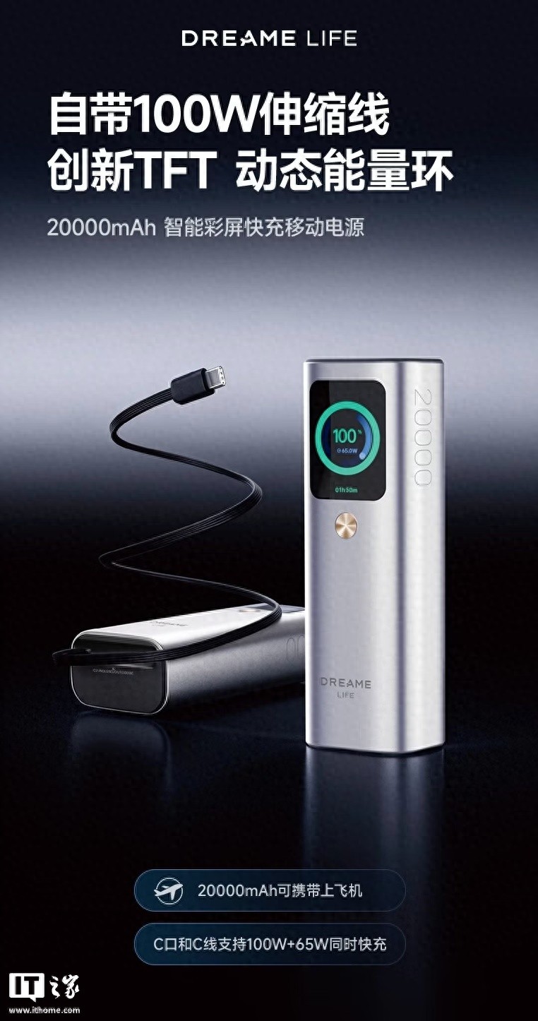 追觅推出自带线165W带屏移动电源:2C+1A,399元