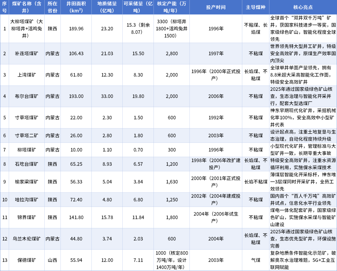 国能神东煤炭集团下属13座煤矿核心指标数据表