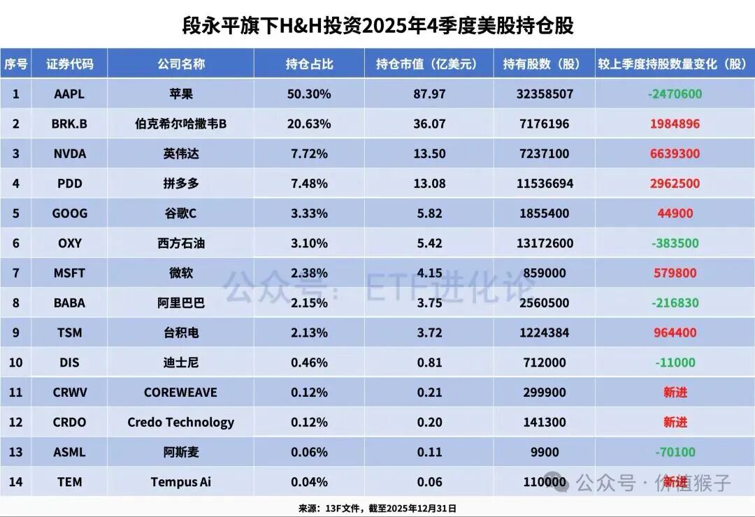 段永平2025Q4千亿持仓曝光:十倍加仓英伟达,越跌越买拼多多,新进三家AI公司