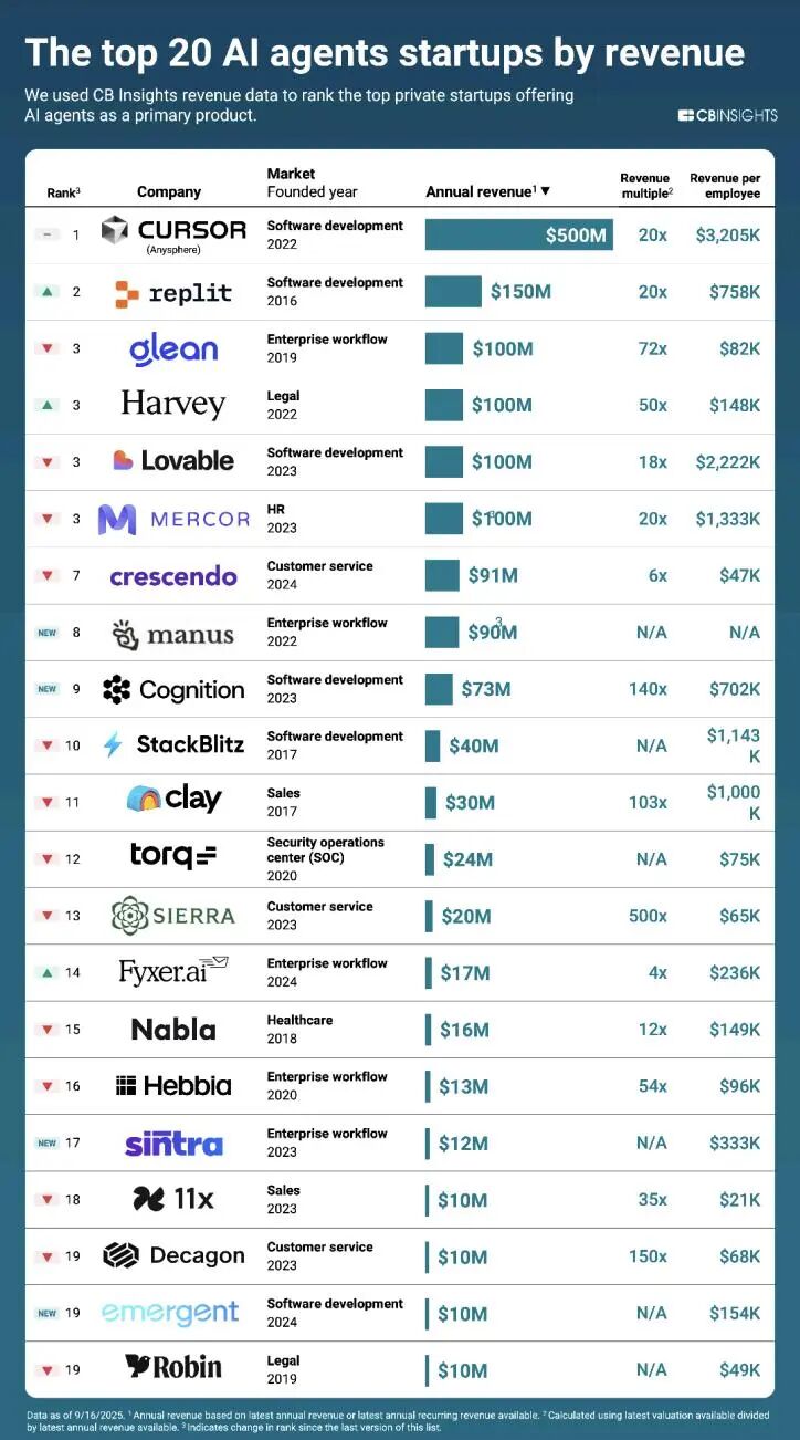 同时,AI编程工具的商业化进程也在加速。CB Insights的数据显示,编程AI智能体在商业化中遥遥领先,Cursor年经常性收入达5亿美元,Replit达1.5亿美元。