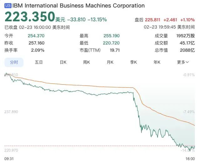 本周一,IBM股价收盘重挫13.15%,报每股223.35美元,创下近年来最大单日跌幅。此次暴跌的直接诱因,是人工智能公司Anthropic宣布其旗下的Claude Code工具具备了对运行COBOL语言的老旧系统进行现代化改造的能力。
