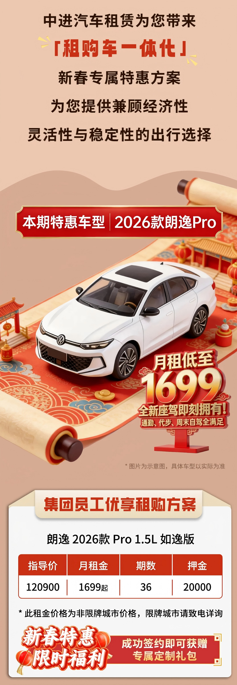 本次活动由国机集团下属中进汽贸服务有限公司(简称“中进汽车租赁”)提供服务,依托“租购车一体化”业务模式,为国机集团员工提供租赁购车方案:大众朗逸2026款Pro 1.5L如逸版车型,押金20000元,36期,月租金1699起。“