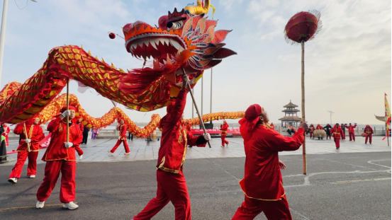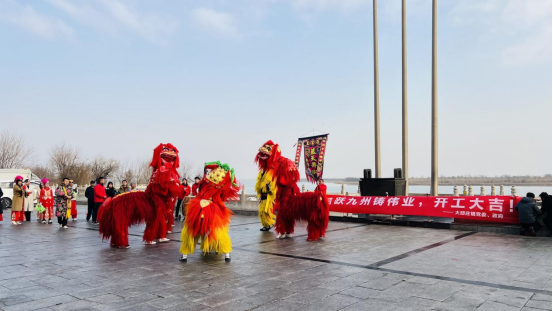 龙狮齐舞寓意风调雨顺、百业兴旺。上午8时18分,在位于团泊湖畔的天津友发钢管集团股份有限公司门前,激昂澎湃的《赛马》鼓声响彻云霄,长龙翻腾起舞,雄狮灵动跳跃,秧歌队伍彩扇如潮……