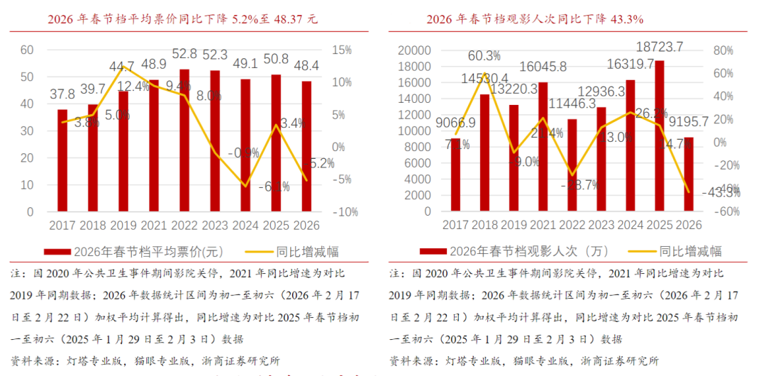 据专业平台数据显示,2026年春节档初一至初六(2月17日至2月22日)平均票价约为48.37元,较2025年同期的50.81元有所回落,且日均平均票价持续走低。