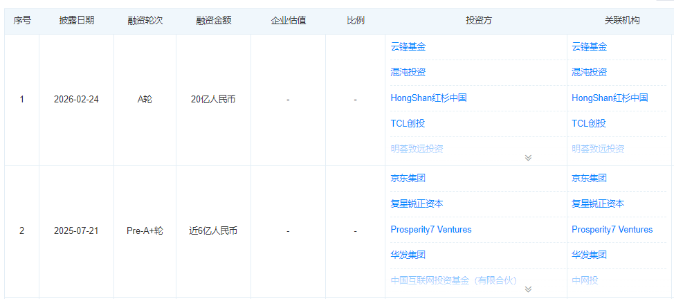 2026年2月(最新两轮):连续完成两轮融资近20亿元,估值突破百亿。本轮融资阵容汇聚了顶级资本、产业巨头与国有资本的多方力量。云锋基金、混沌投资(葛卫东)、红杉中国等超一线机构重磅入局;Synstellation Capital、TCL创投、明荟投资等产业资本协同加注;重庆产业投资母基金、杭州金投等国有资本鼎力支持。