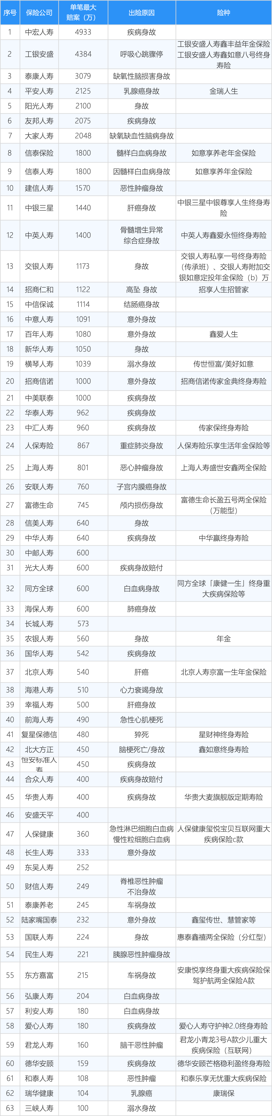 公布了最大赔案的63家公司中