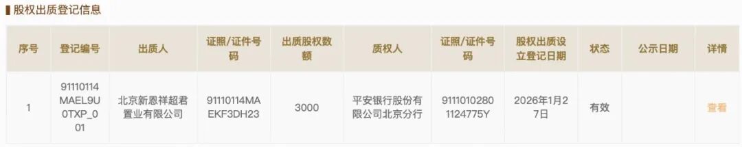 年前,北京新恩祥超君置业将持有北京新恩祥睿泽置业(凌雲颂项目公司)价值3000万股权,一股脑全出质予平安银行北京分行,登记日期为1月27日。