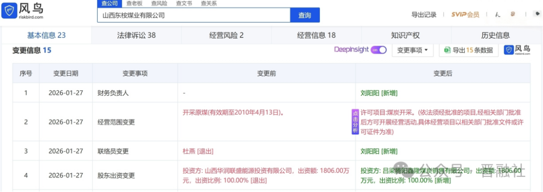 企业查询网站风鸟显示,东桉煤业已完成工商变更,股东已由华润联盛变更为腾阳能源集团旗下的吕梁腾阳鑫隆煤炭销售有限公司。