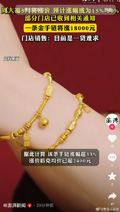 -刚需群体被迫追高:婚庆消费者加速购买"三金",北京、上海门店现10万元以上大单,部分消费者因担忧续涨而"越贵越买";
