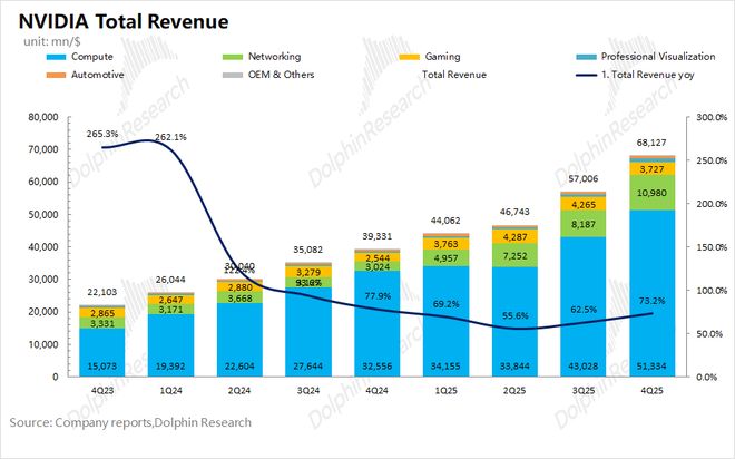 当前云服务厂商依然是公司AI芯片的最大购买方,因而下游云厂商的资本投入构成了公司数据中心业务增长的基础。而结合四家公司(谷歌、Meta、微软和亚马逊)的管理层交流,海豚君预期四大厂商在2026年的资本开支有望达到6600亿美元以上,同比增长62%,这也为公司2027财年的业绩高增长带来了保障。