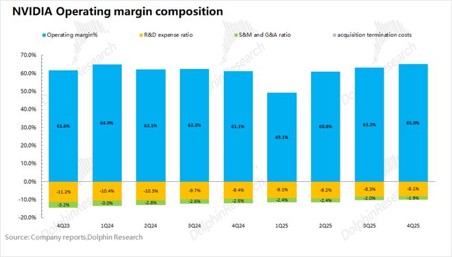 2026财年第四季度英伟达核心经营利润率为65%,继续提升,主要是受毛利率回升以及经营费用率下降的影响。