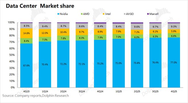 当前“谷歌Gemini+博通”已经占据将近一成左右的市场份额,将逐渐对英伟达在AI市场上产生挑战,有可能进一步影响英伟达在AI芯片市场的份额及毛利率(市场担心毛利率在2026年之后出现下滑)。