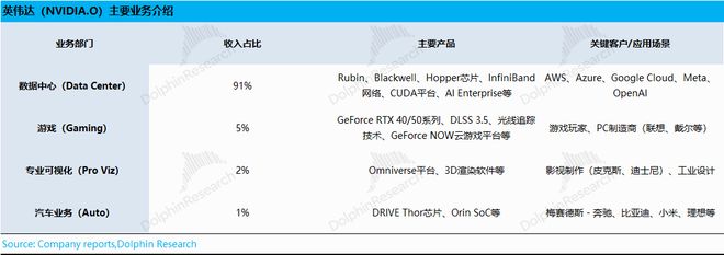 1)数据中心业务:是当前最主要的关注点,其主要产品包括Blackwell、Hopper等算力芯片,公司的核心客户是亚马逊、微软、谷歌等云服务大厂;