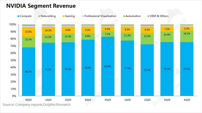 在AI Capex的带动下,英伟达的数据中心业务(Compute+Networking)的收入占比已经超过了9成,而游戏业务的占比被挤压至一成以下。