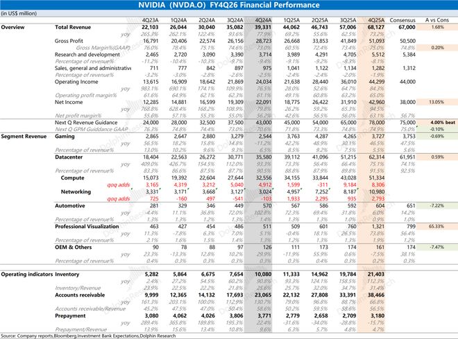 英伟达(NVDA.O)北京时间2026年2月26日凌晨,美股盘后发布2026财年第四季度财报(截至2026年1月),具体内容如下: