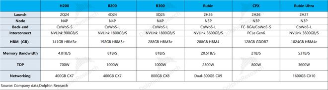 c)Rubin新产品的进展:当前英伟达的主要产品是B300系列,而公司计划将在2026年下半年推出Rubin和CPX产品,届时将开始采用台积电3nm工艺,接着公司还将在2027年继续推出Rubin Ultra产品。