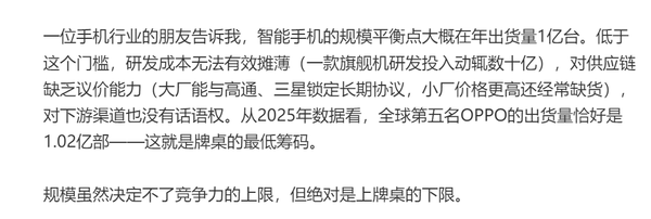 一位手机行业人士透露,智能手机的规模平衡点大概在年出货量1亿台。低于此门槛,研发成本无法有效摊薄,对供应链缺乏议价能力,对下游渠道也无话语权。2025年全球第五名OPPO出货量恰好是1.02亿部,这是行业“入场”的最低筹码。